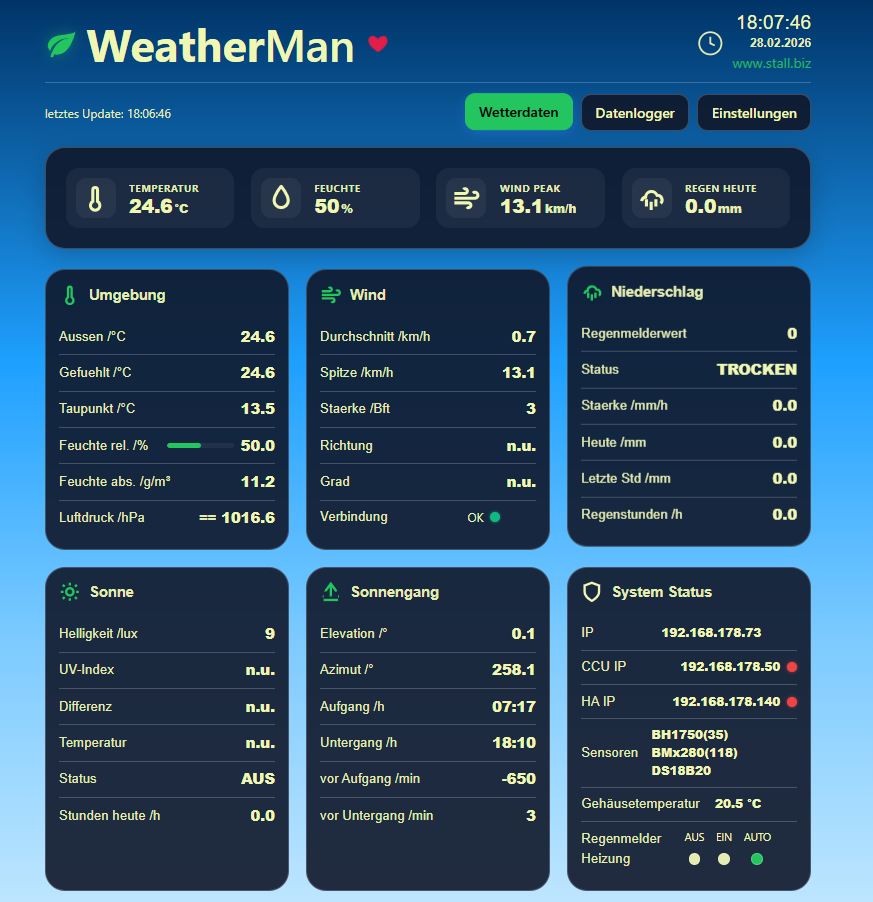 Für den neuen WeatherMan 3 wurde eine komplett neue Firmware entwickelt, die auf die Belange meoderner WebUis ausgerichtet ist. Die Darstellung der Wetterdaten und auch die umfangreichen Sensor-Einstellungen erfolgen im typischen Windows-Fenster-Stil und sind sowohl auf dem PC als auch auf Tablet und Smartphone sehr übersichtlich. Zudem ist mit dieser Firmware auch eine komfortabele Anbindung und Übertragung der Daten an eine Homematic-CCU als auch zu einem Homeassistant-Server möglich.