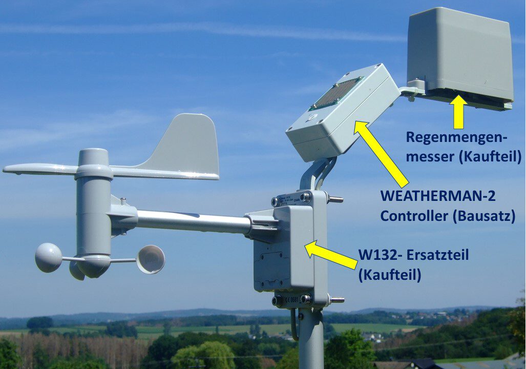 Insgesamt besteht der WEATHERMAN aus den im Bild gezeigten Modulen, wobei der Regenmengenmesser und das W132 Ersatzteil fertig gekauft werden. Der WEATHERMAN-Controller kann als Bausatz in meinem Webshop gekauft werden. In der ausführlichen umfangreichen Bauanleitung wird genau beschrieben, wie die Wetterstation zusammen gebaut wird. Zum Überblick hier nur die wesentlichen Schritte: